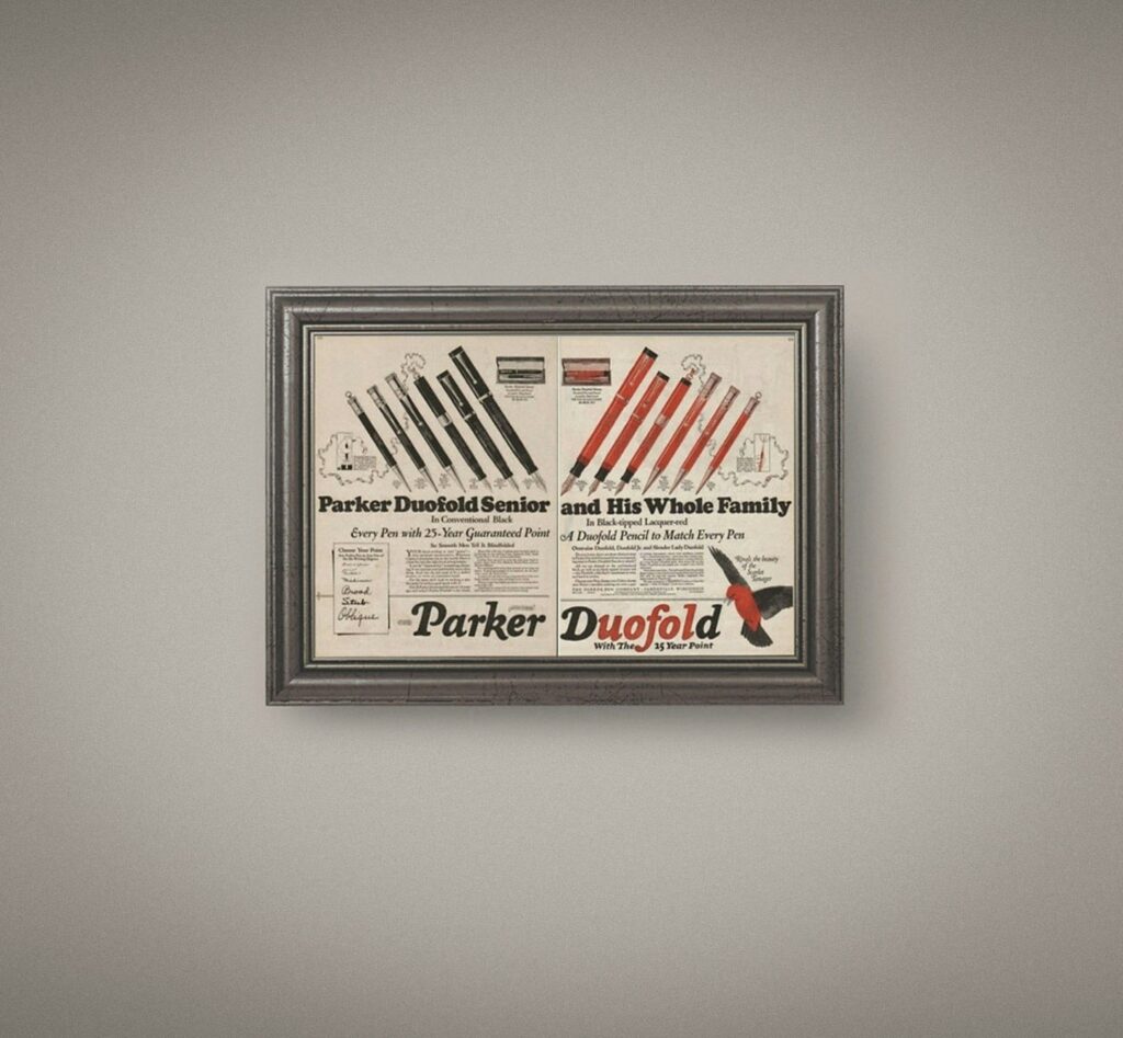 A Parker bemutatja a Duofoldot – egy nagyméretű, merész, prémium kategóriás tollat, amely tökéletesen megtestesíti a pezsgő húszas évek szellemét. Nem sokkal később a Duofold világhírűvé válik a „Big Red”-ként, élénk narancssárga színével és 25 éves garanciájával.