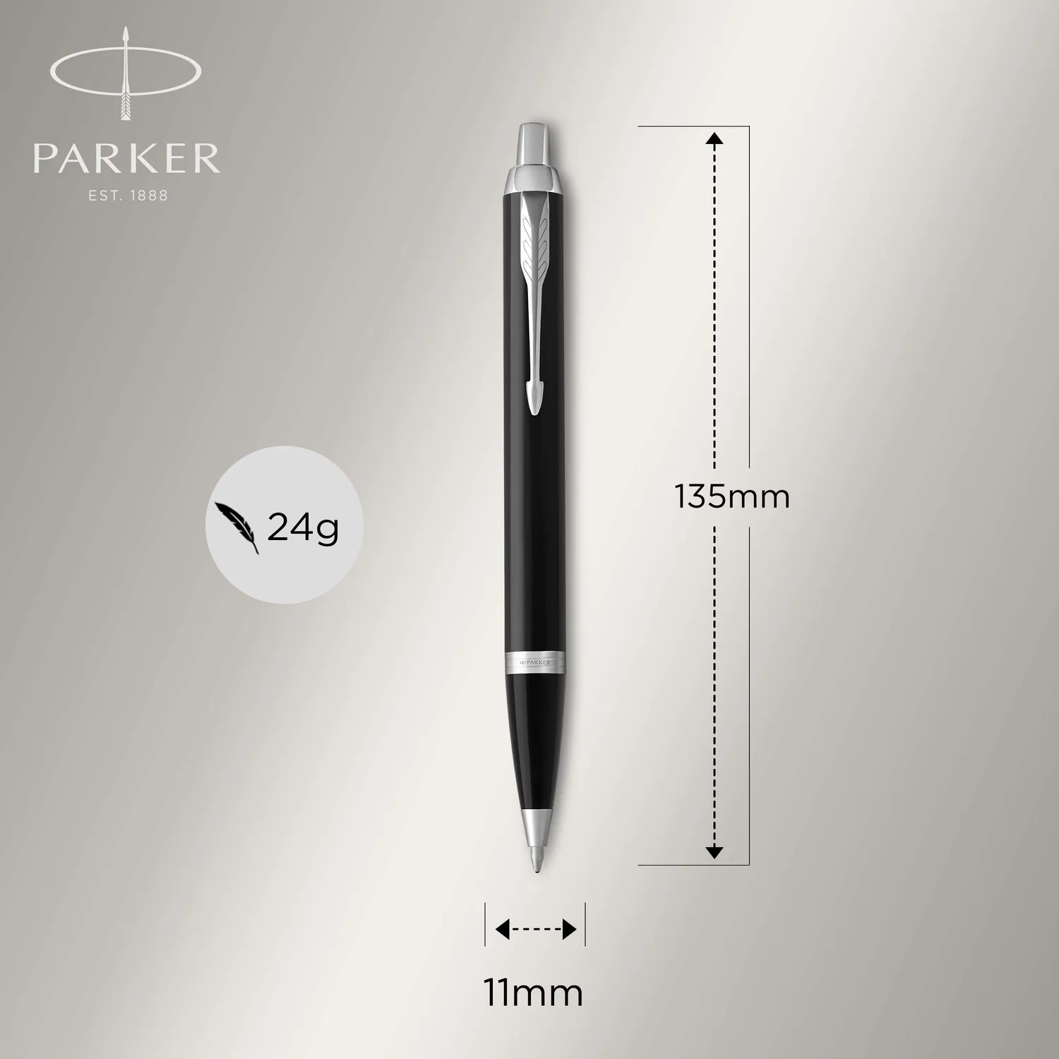 • Fényes fekete lakkozott felület, amelyet a króm díszítés és a jellegzetes PARKER nyíl alakú klipsz tesz teljessé.