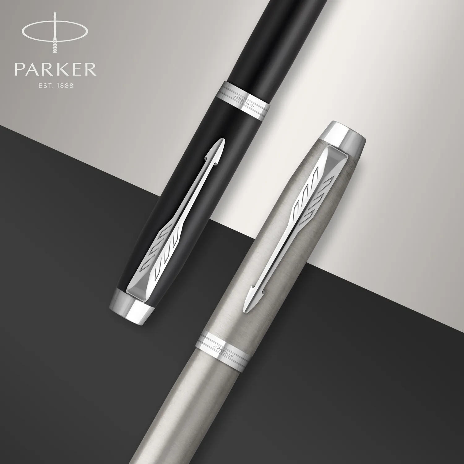 • Fényes rozsdamentes acél felület króm díszítéssel és a jellegzetes PARKER nyíl alakú klipsszel.