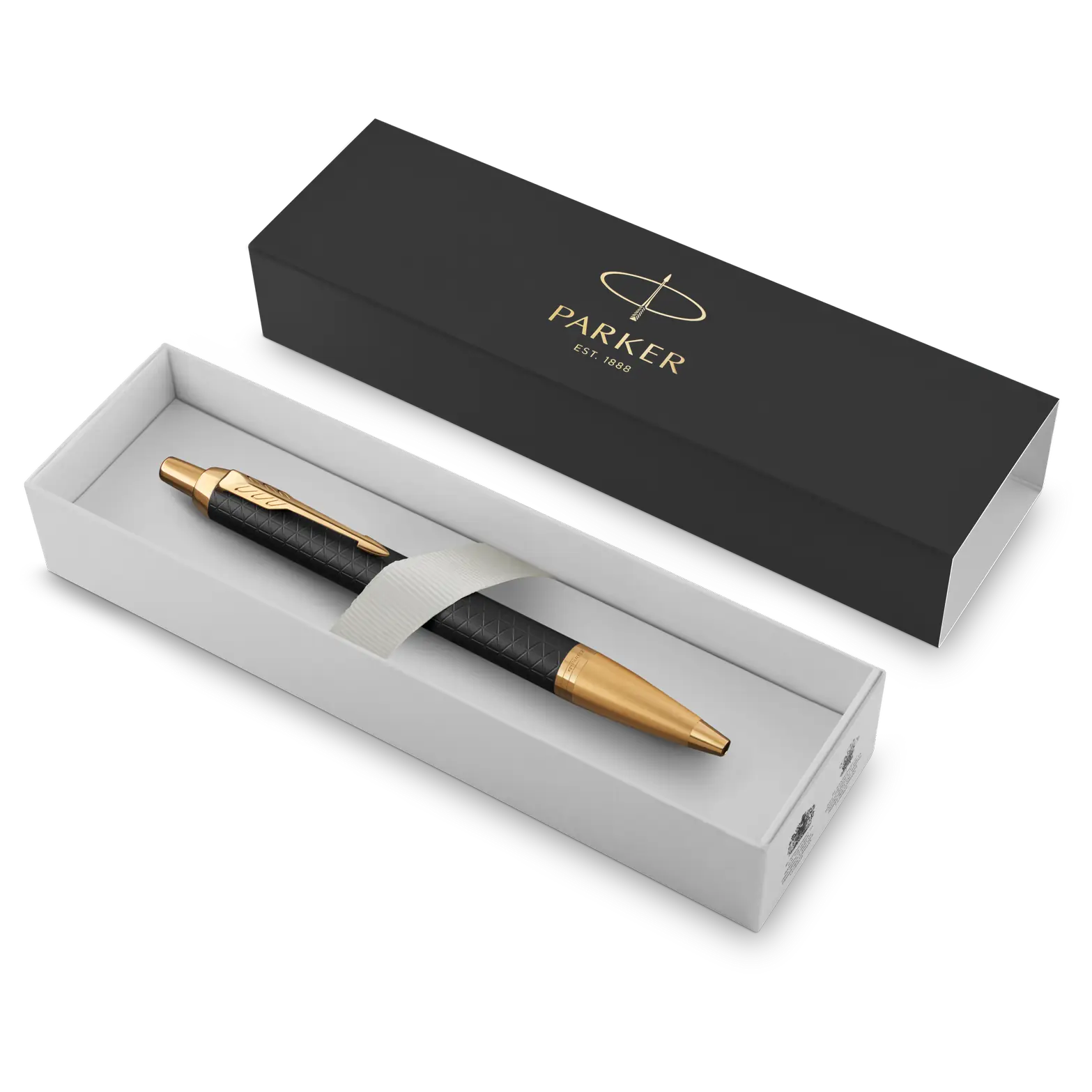 • Fekete alumínium tolltest, gravírozott modern mintával, arany részletekkel és a jellegzetes PARKER nyíl alakú klipsszel.