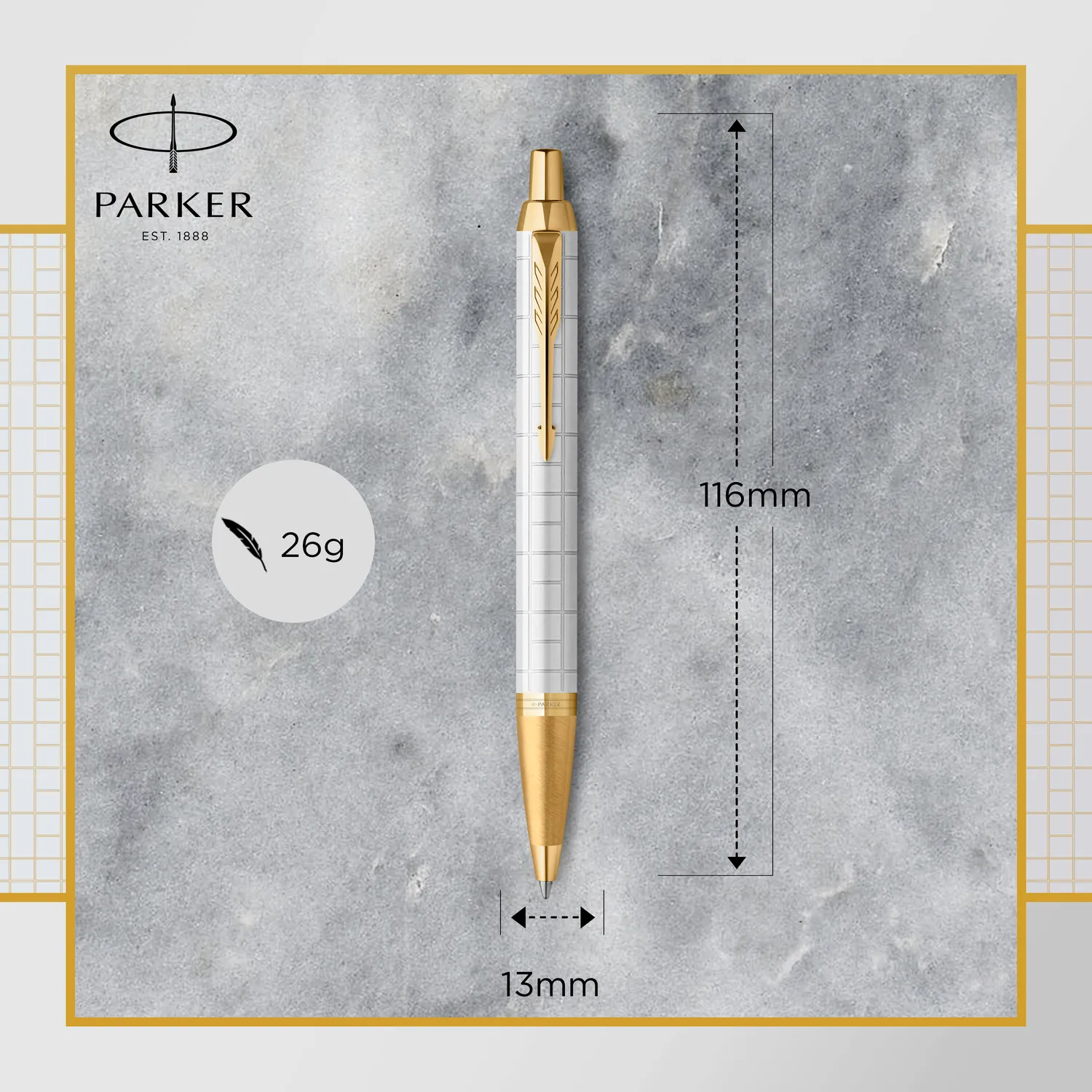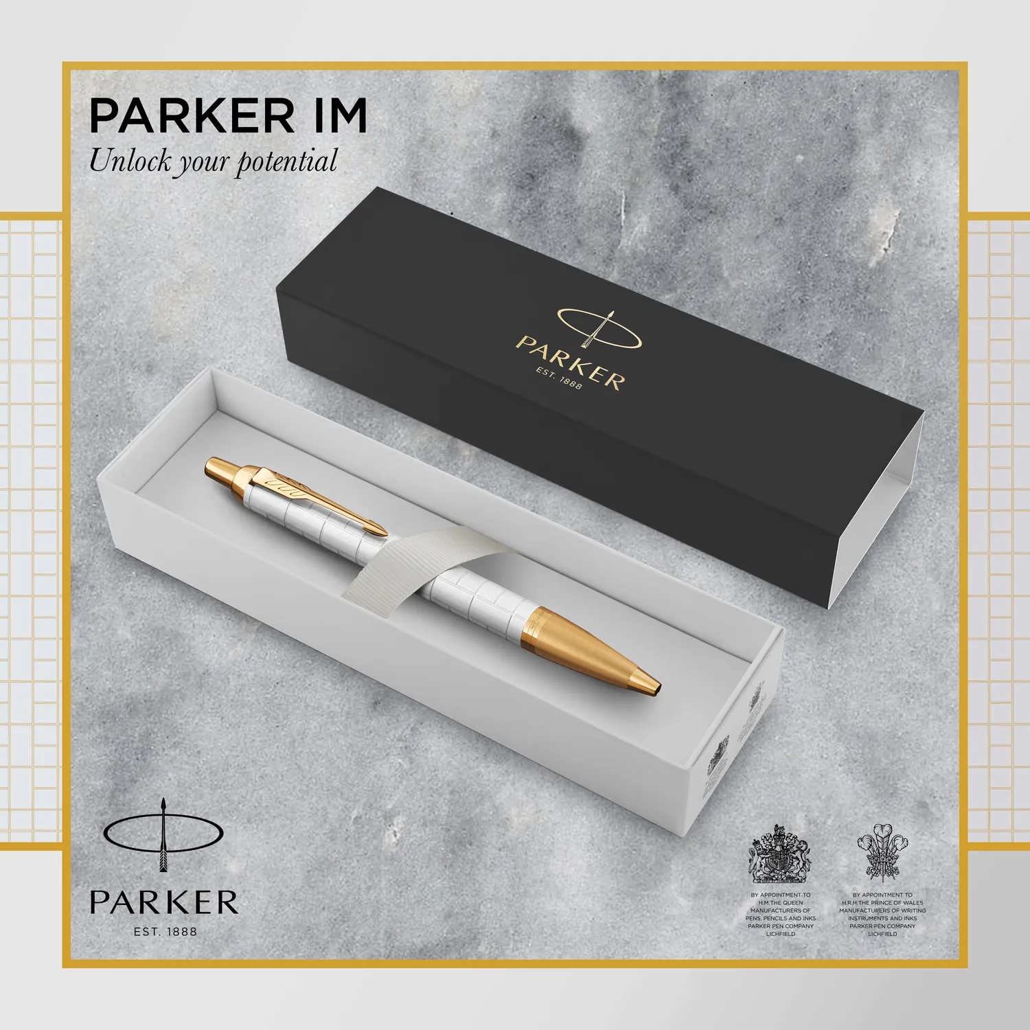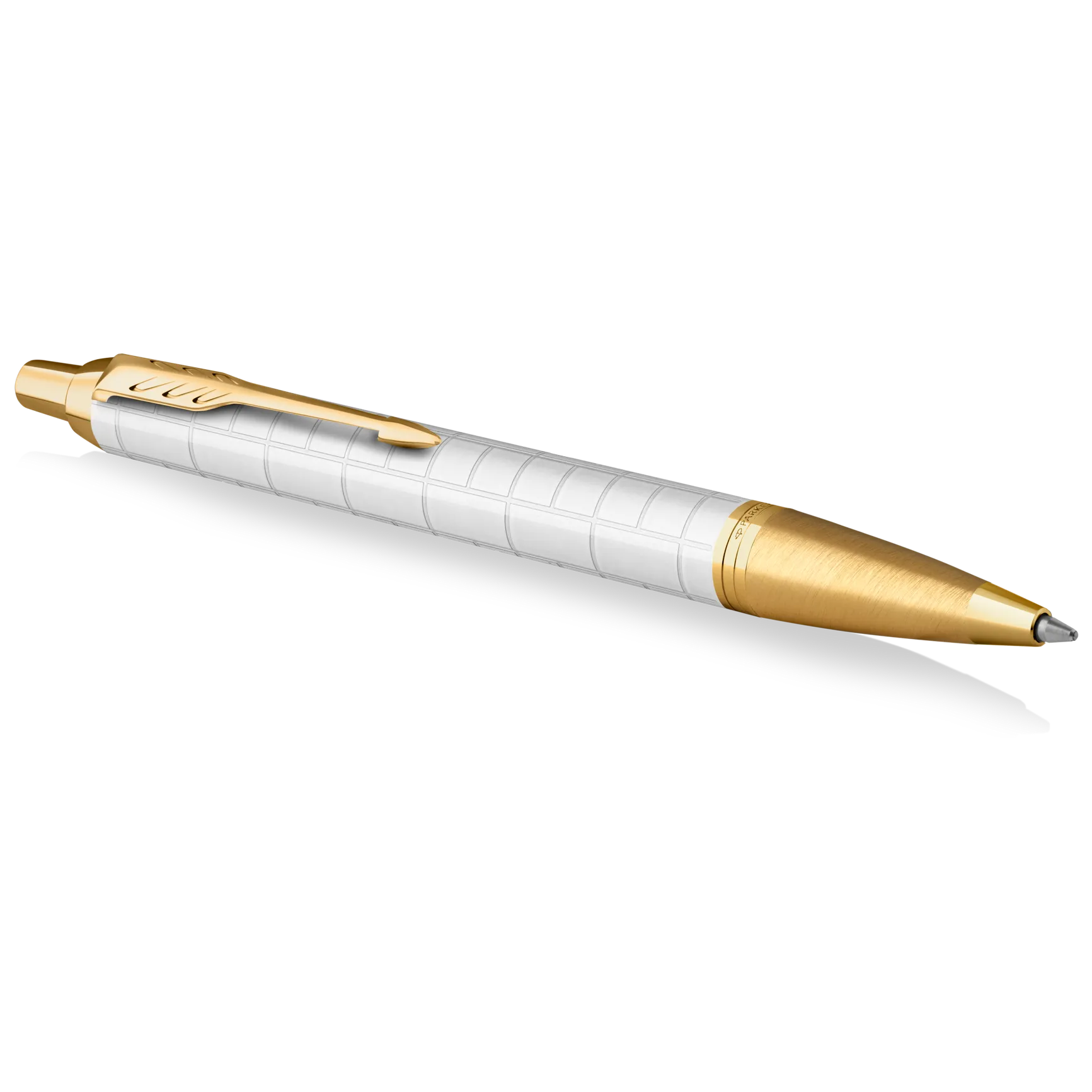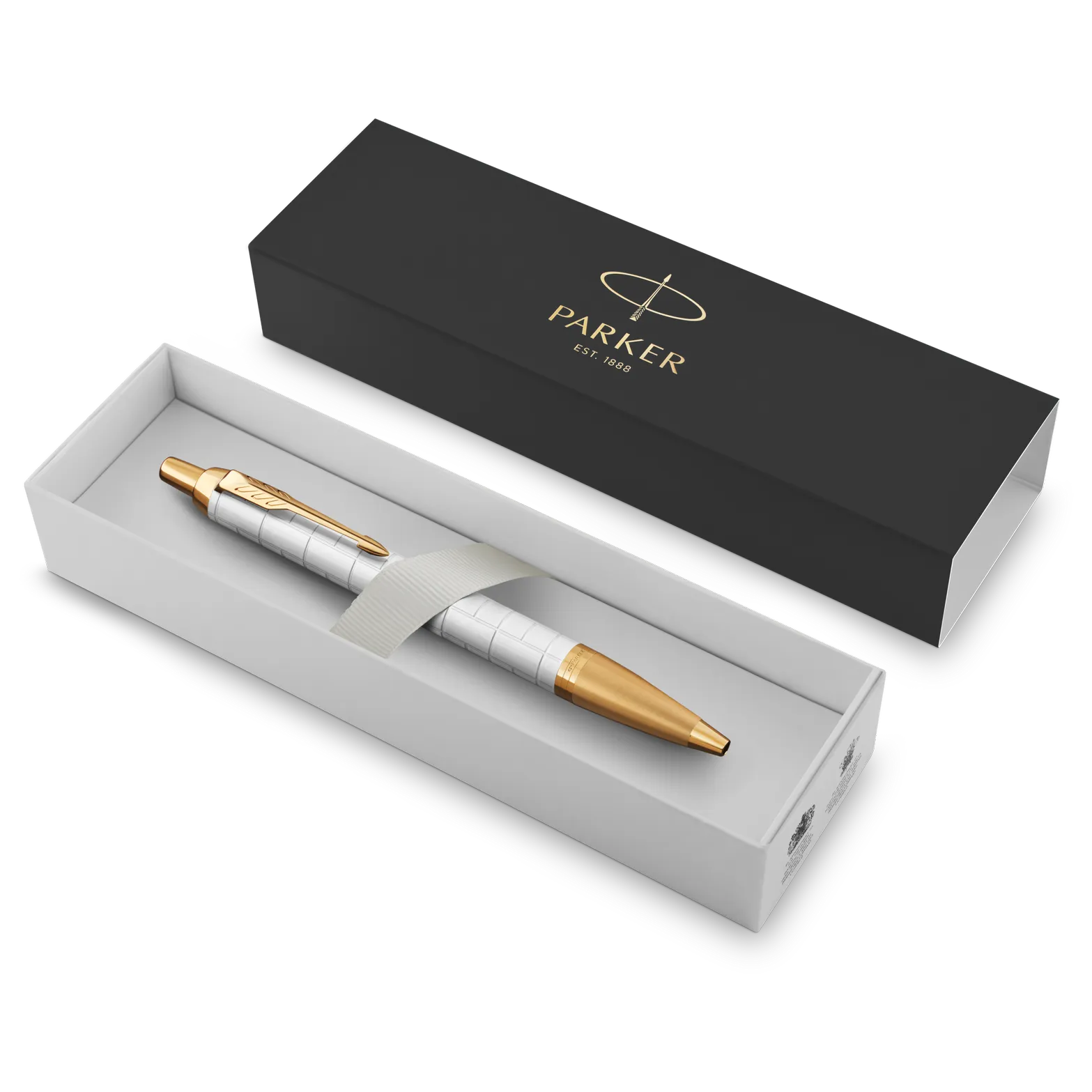 A Parker IM Premium golyóstoll elegáns és professzionális megjelenést kínál. Áramvonalas formája és gyöngyházfényű lakkozott teste arany díszítéssel tökéletes harmóniát alkot. A Quinkflow tintatechnológia sima, megbízható írásélményt biztosít. Parker prémium ajándékdobozban érkezik – ideális üzleti ajándék vagy mindennapi használatra.