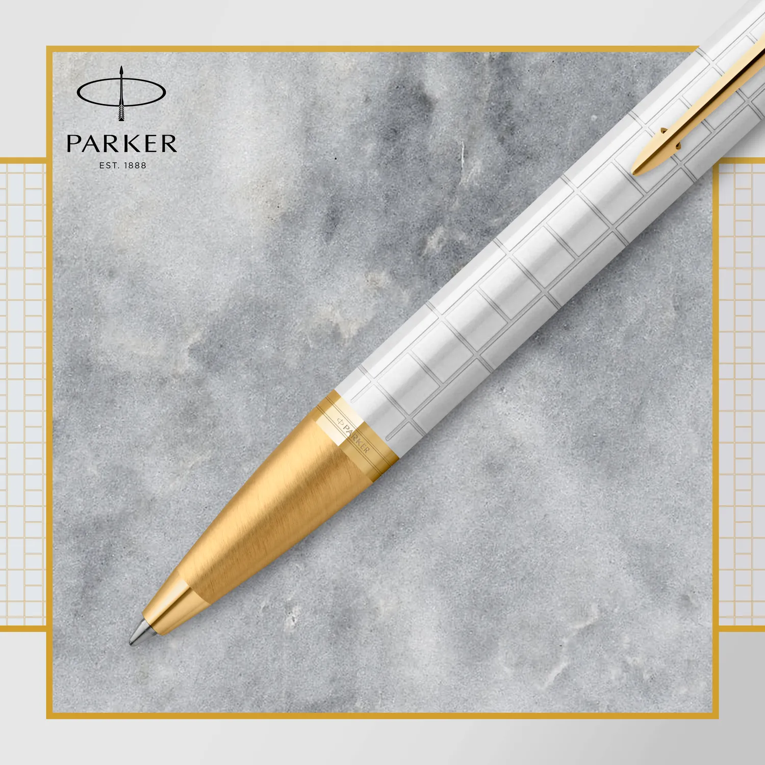 • Gyöngyházfényű lakkozott tolltest és kupak, modern, aszimmetrikus négyzetmintával gravírozva, aranyszínű díszítéssel és a jellegzetes PARKER nyíl alakú klipsszel.