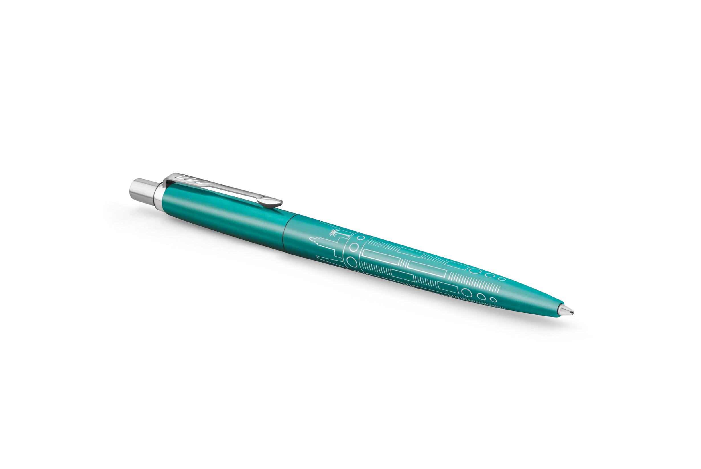 A Parker mesteri kivitelezésének lenyűgöző példájaként az egyedi dizájn precízen lézergravírozva jelenik meg a toll testén. A türkiz lakkozott felület, a sima írásélmény és a Jotterre jellemző ikonikus „kattanás” teszi teljessé ezt az elegáns tollat.