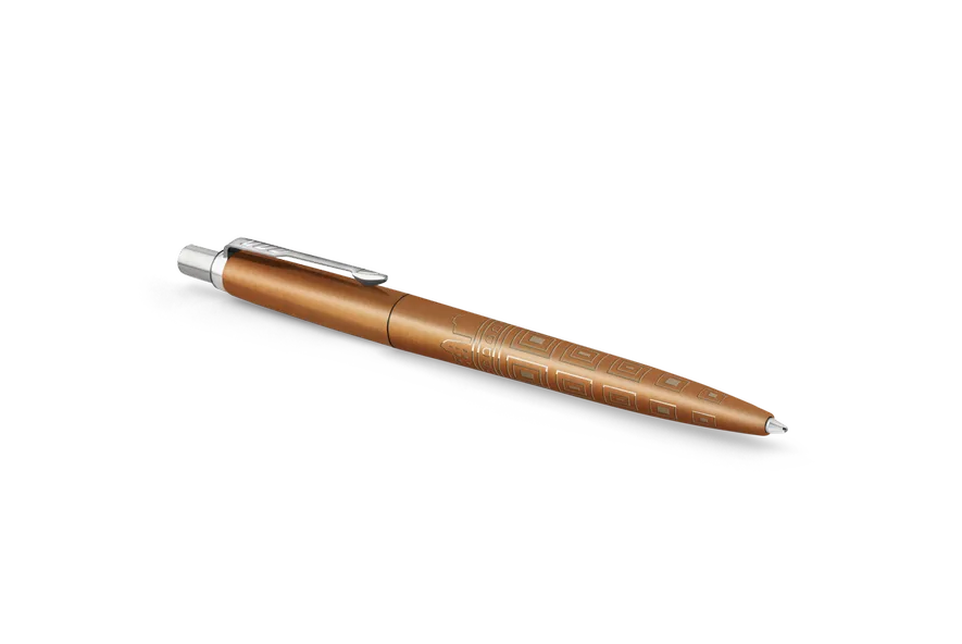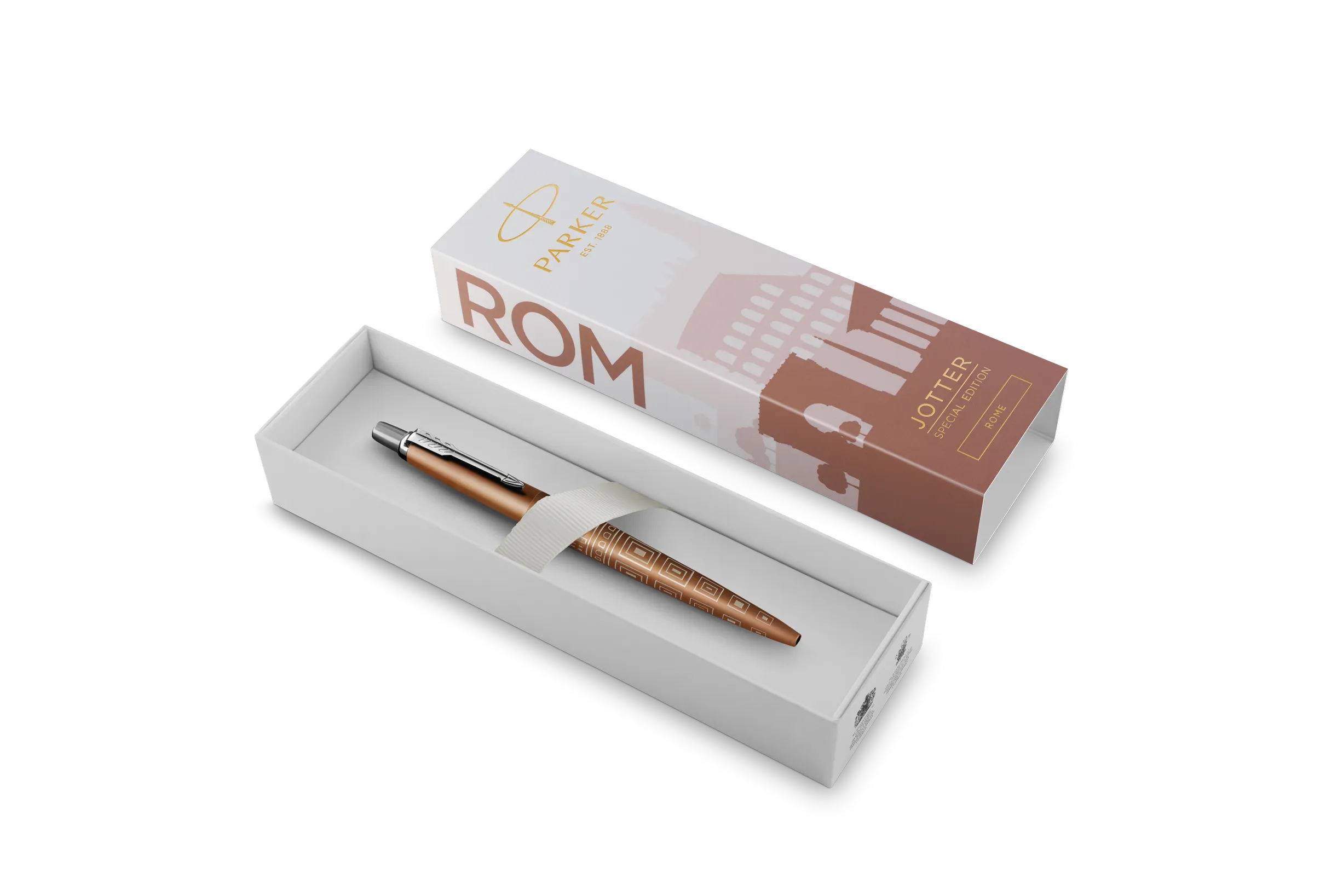 A Parker Jotter család elhívja egy világkörüli kalandra, amely harmadik állomása Róma 3000 éves építészetét és dekorációját idézi meg. A toll testén lévő lézergravírozott design a Pantheon egyedülálló kupolájának mintáját és az ősi város látképét ábrázolja. A selyem bronz lakkozott felület kényelmes írást biztosít. A Jotter Róma golyóstoll az utazás szerelmeseinek készült, hogy inspirációt adjon a világ felfedezéséhez.