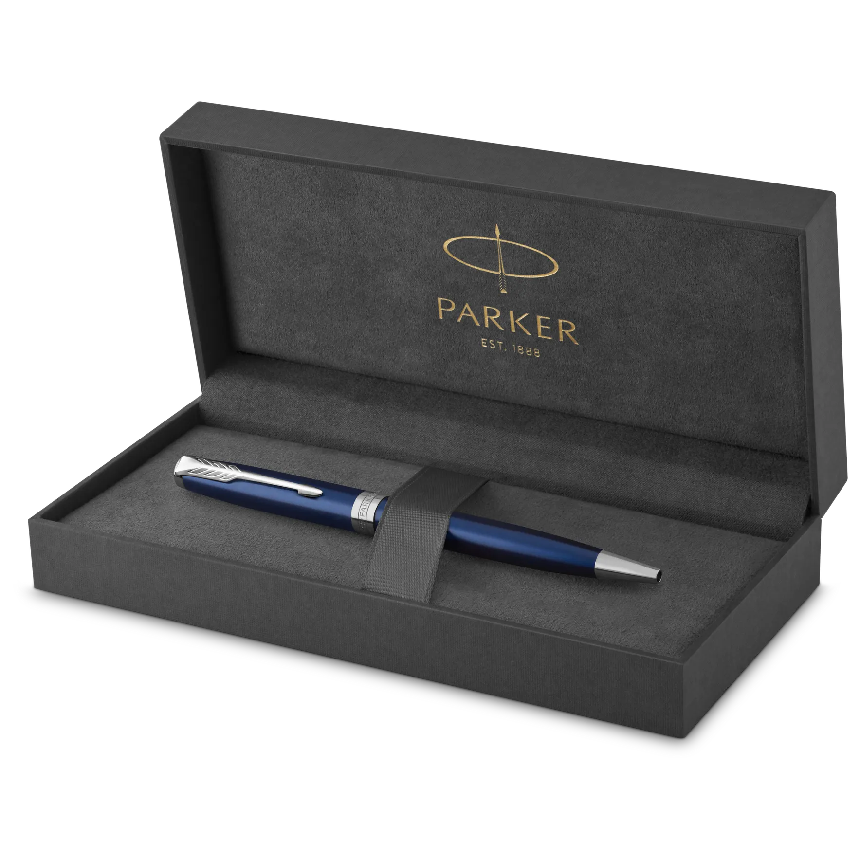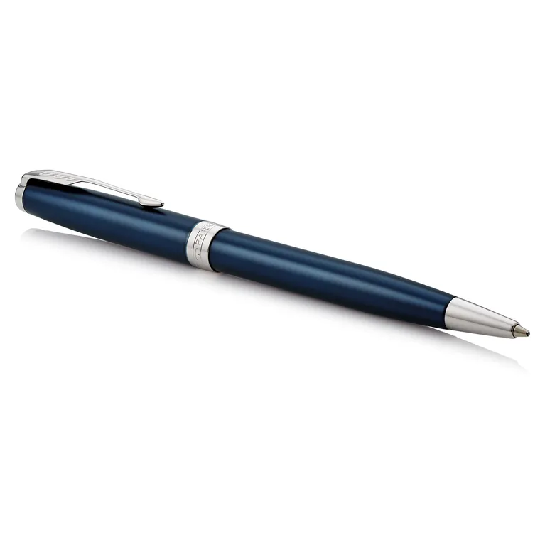 Tapasztalja meg a sima, tiszta és egyenletes írás élményét a Parker Sonnet golyóstollal. Időtálló és elegáns, visszahúzható csavaros mechanizmussal és közepes heggyel rendelkezik. A fényes kék lakkozott testet és kupakot ezüst bevonatú klipsz és díszítőelemek egészítik ki, így minden részlet a Parker kézműves hagyományait tükrözi. Minden toll kézzel szerelt és ellenőrzött, hogy hibátlan minőséget és kivételes írásélményt biztosítson.